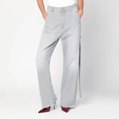 Wide jeans by DARKPARK in gray cotton denim with a faded effect, characterized by belt loops, front closure with zip and button, five classic pockets, visible stitching, raw hem, back logo patch, and side detail with buckle belt.
