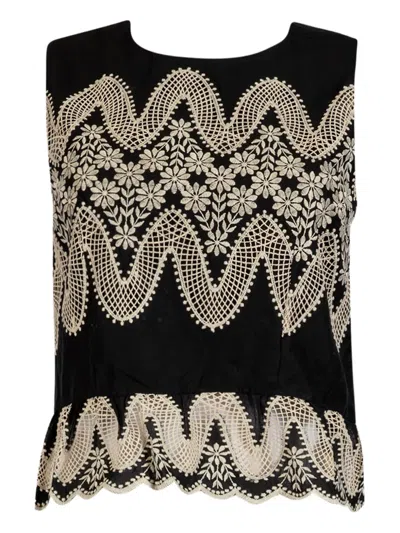 黑色 刺绣细节 圆领 背面拉链开合 无袖 扇贝形边