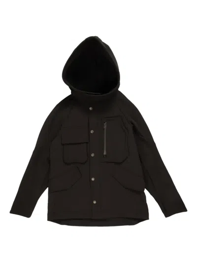 黑色 正面饰有摁扣 经典兜帽 正面拉链口袋 侧置三个盖袋