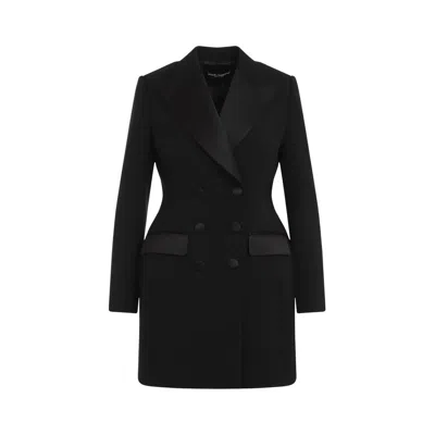 Style Notes Dolce & Gabbana looked to the tuxedo as a starting point for this season. Part of the AW24 runway collection, this wool-blend blazer is impeccably tailored to a slim double-breasted silhouette and finished with silk-satin trims for a classic tuxedo jacket look.; Info & Care Dolce & Gabanna wool-blend blazer Silk satin peaked lapels, padded shoulders, faux button fastenings at cuffs, chest patch pocket, darted waist, two front flap pockets, silk trims, silk lining Double-breasted button fastenings at front 79% wool, 16% silk, 5% polyester; lining: 100% silk Dry clean Size & Fit Length shoulder to hem: 31 inches/ 78.5cm Midweight Semi-fitted style, slim across the waist Model is 5'9"/ 175cm and wears a size IT40