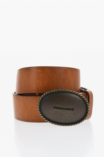 DSQUARED2 Solid Color Leather Belt With Oval Buckle 35mm In Brown