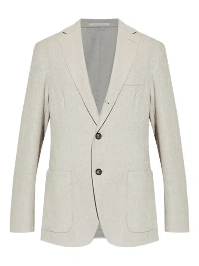 浅灰色 正面双纽扣 贴袋 平驳领 长袖 羊毛混纺