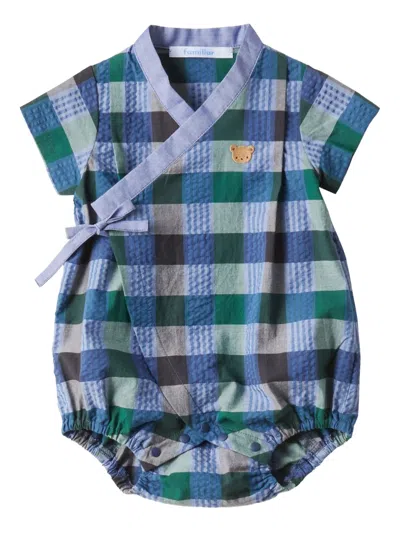 蓝色 格纹 裹身式开合 短袖 小熊图案