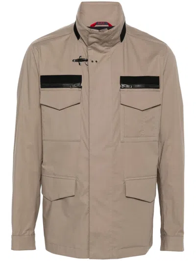 栗棕色 府绸质感 防水 罗缎边饰 立领 摁扣袖口长袖 两个正面拉链口袋 四个正面盖袋 无衬里 平直下摆 正面饰有拉链开合 摁扣 钩扣