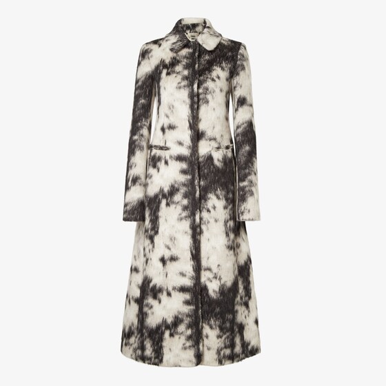 Long, slightly flared coat. Shirt collar, long sleeves and horizontal welt pockets. Concealed front fastening. Made of long-haired wool with an exclusive Frosted Fauna motif printed all over: a nuanced reinterpretation of the timeless black and white animalier print, inspired by an archive coat by Silvia Venturini Fendi. Made in Italy. Size 42