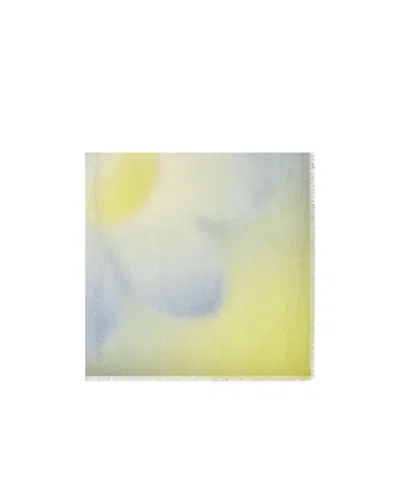 Fendi shawl made with a blend of cotton and silk featuring a yellow and blue Floral Dégradé motif. The pattern plays with faded nuances where a flower in full bloom emerges in the center on a delicate FF jacquard base. Embellished with fringed border. Lightweight and wraparound, suitable for all seasons.