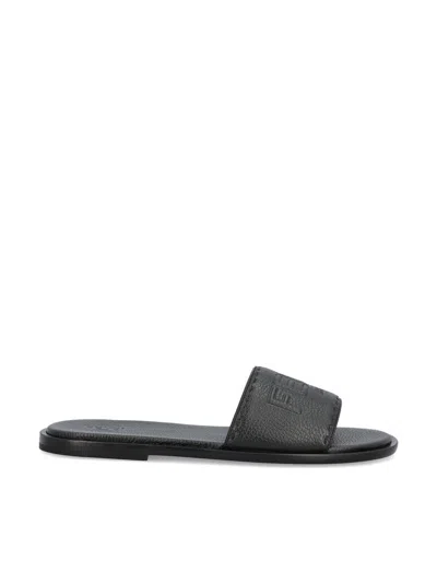 黑色 皮质 压纹logo 露趾 平底 穿套式