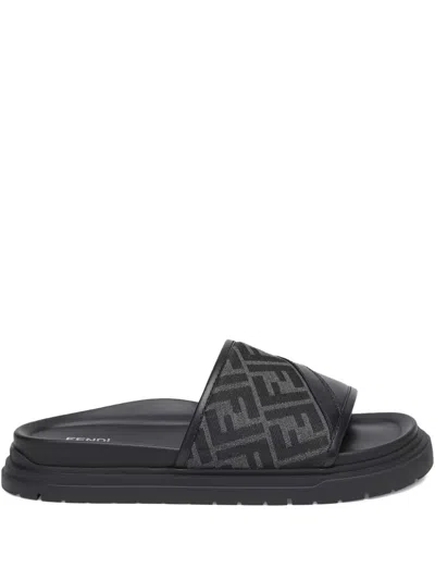 FENDI Men Low Leather Sandals With Ff Jacquard Insert In Black