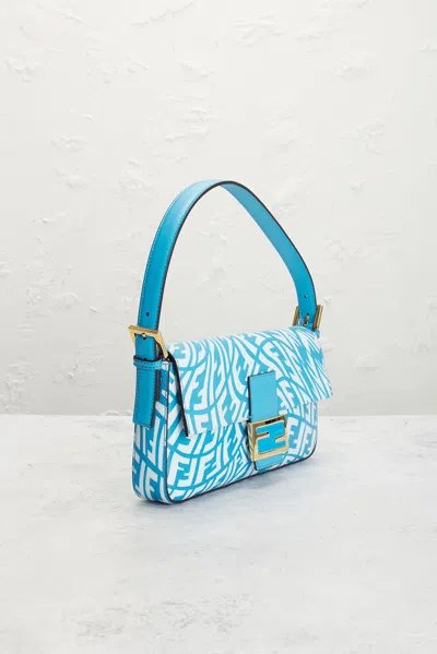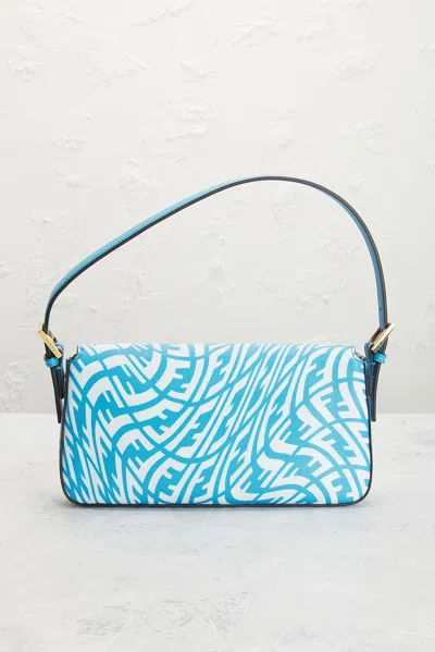 fendi Fendi X Sarah Coleman FF Vertigo Baguette in Blue - Blue,White. Size all. Blue ff vertigo glazed coated canvas exterior with blue vitello king calf leather trim, satin lining and gold-tone hardware. Made in Italy. Magnetic snap closure. One main compartment. 1 interior zip pocket. Original brand dustbag included. Measures approx 10.5 W x 5.5 H x 1.5 D Shoulder strap with a 7.5 drop. Excellent. Light scratching to exterior hardware. Original brand box, authenticity card, and hang tag not included. FNEF-WY7944. 13192171. About the designer: