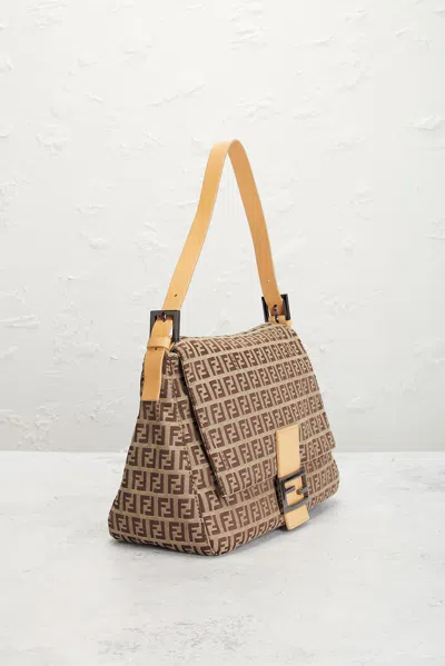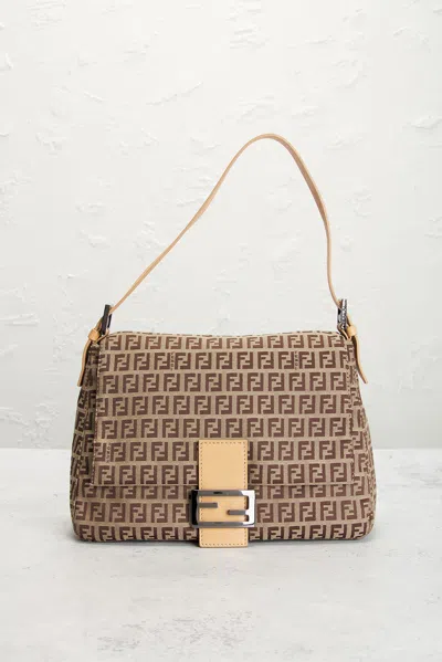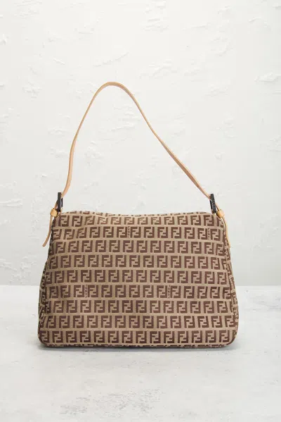 fendi Fendi Zucchino Mama Baguette Shoulder Bag in Beige - Beige. Size all. Beige zucchino canvas exterior with beige calfskin leather accents, textile lining and silver-tone hardware. Made in Italy. Magnetic snap closure. One main compartment. 1 interior zip pocket. Original brand authenticity card and care booklet included. Measures approx 11 W x 8 H x 4.5 D Shoulder strap with a 7 drop. Good. Light scratching to exterior hardware. Light marks to leather strap. Light wear throughout. Original brand box, dustbag, and hang tag not included. FNEF-WY7952. 13192176. About the designer:
