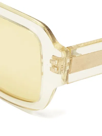 pale yellow square frame gold-tone metal details sculpted shape These glasses come with a protective case. Condition: GOOD. This previously owned and used item is in good condition with minimal signs of use. This may include fading of material or plating and scratches.