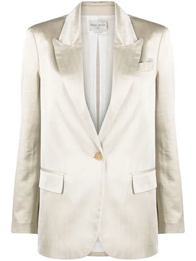 沙米色、棉质混纺、缎面织物、捏褶肩部、梯形翻领、正面纽扣、长袖、胸口饰有平袋、两个侧置平袋、后中开衩、全衬里。