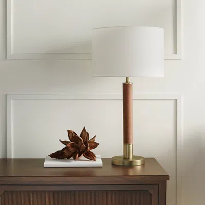 <div class="updp-details-container">This lighting collection composed of leather and brass-finished accents features a timeless modern design. Includes an Ivory linen drum shade. This piece will provide a beautiful addition to the decor of any room.Made of steel with a champagne brass finish. Warm brown leather accents. Ivory linen drum shade. Requires one 60-watt or LED equivalent A19 Bulb. For a brighter light, we suggest using a higher-lumen LED bulb. However, do not exceed recommended wattage. E26 socket type. Dimmer switch. 6 ft. black fabric wrapped cord. Dust with soft dry cloth. A Frontgate exclusive.At Frontgate, our primary focus is quality. We guarantee that every product we sell will stand up to the supreme test our customers satisfaction. To learn more about our policies, visit our Shipping & Processing, Returns & Exchanges and Warranty & Price Guarantee pages.