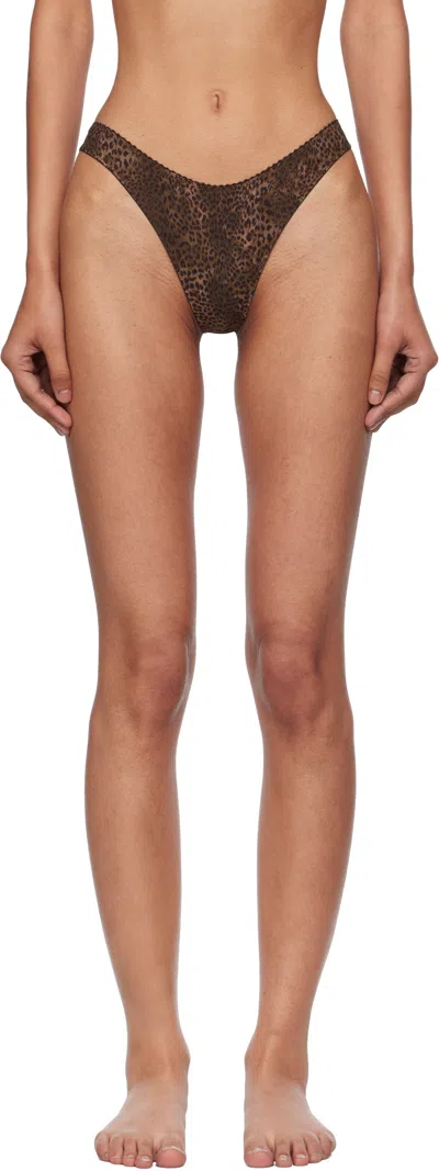 Stretch nylon jersey thong. · Leopard pattern printed throughout · Picot trim at elasticized waistband Supplier color: Leo