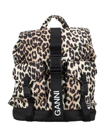 The Leo backpack by GANNI is a testament to contemporary fashion, crafted from 100% recycled polyester. Its striking leopard pattern commands attention, while the adjustable shoulder straps ensure comfort during any adventure. Designed with practicality in mind, it features multiple pockets to keep essentials organized, complemented by a chic top flap that adds a fashionable flair. Ideal for the modern woman on the go, this backpack combines sustainability with style effortlessly.- Material: 100% recycled polyester - Dimensions: Everyday use design - Gender: Women - Color: Neutral tones