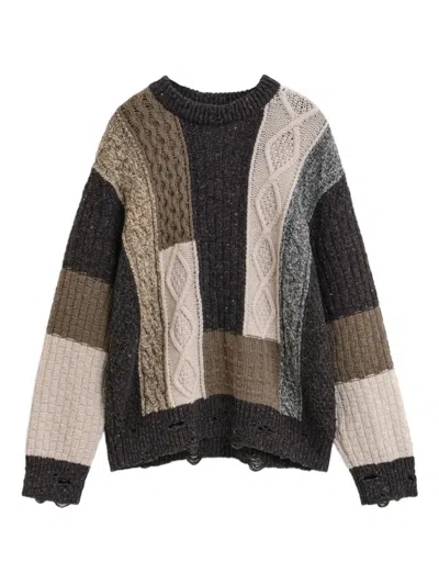 褐色 拼贴设计 绞花针织 圆领 长袖 仿旧下摆