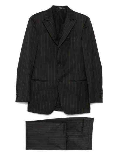 约1990年代 炭灰色 初剪羊毛 条纹细节 正面纽扣 戗驳领 胸口饰有平袋 省道细节 两个正面双嵌线袋 长袖 搭扣袖口 正面饰有隐藏式纽扣、钩扣和拉链开合 腰带袢 两侧饰有挖袋 压褶 两个背面双嵌线袋