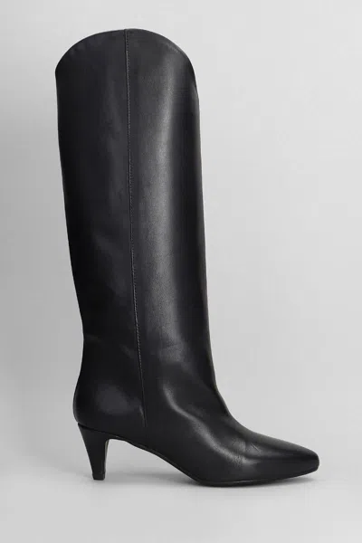 Gitana High heels boots in black leather, almond toe, slip on, curved hem, leather covered heel, leather sole, 60 mm heel, 100% leather, Made in Italy