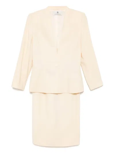 1990-2000年代 米白色 夹克: 正面纽扣 两个正面贴袋 搭扣袖口 全衬里 半身裙: 背面隐藏式钩扣拉链开合 背面开衩 全衬里 状态:很好。这款典藏臻品商品状态很好,略有使用痕迹,可能存在于材料或电镀褪色及划痕。