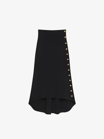 Elevate your wardrobe with the BLACK MILAN STITCH SKIRT, a sophisticated piece that embodies contemporary elegance. Designed with striking gold side buttons featuring an engraved 4G logo, it offers a unique asymmetrical hem that gracefully highlights the legs. Perfect for adding a touch of luxury to your everyday look. Crafted from a refined blend of 89% viscose, 5% polyamide, 4% polyester, and 2% elastane for comfort and style. Gold side buttons with engraved 4G logo add a distinctive touch. Asymmetrical front hem creates a modern silhouette. | Givenchy Women's Milan Stitch Skirt With Buttons in Black | Size Small | BW40XQ4ZPG Color 001