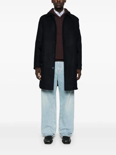 午夜蓝色 强缩羊毛混纺 正面纽扣 宽领 长袖 双扣胸袋 侧开衩 平直下摆 及膝