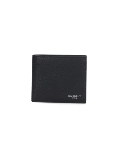 Givenchy bi-fold wallet in black leather with two inside bill pockets, four card slots, coin wallet with snap button closure, metal logo on the front. Composition: 100% Calf Leather