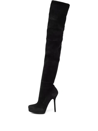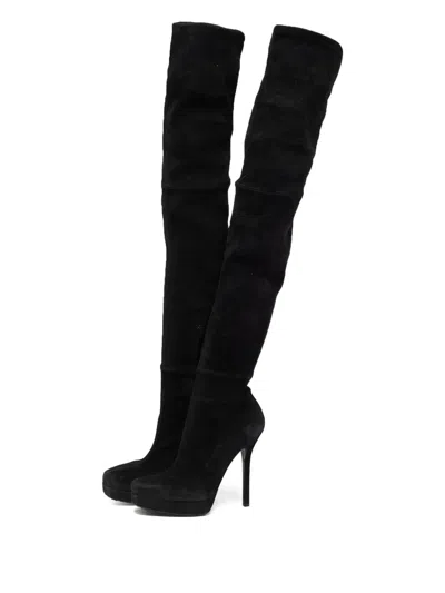 黑色 绒面皮 侧置拉链 细高跟 杏仁鞋头 过膝 皮质底 状态:很好。这款典藏臻品商品状态很好,略有使用痕迹,可能存在于材料或电镀褪色及划痕。