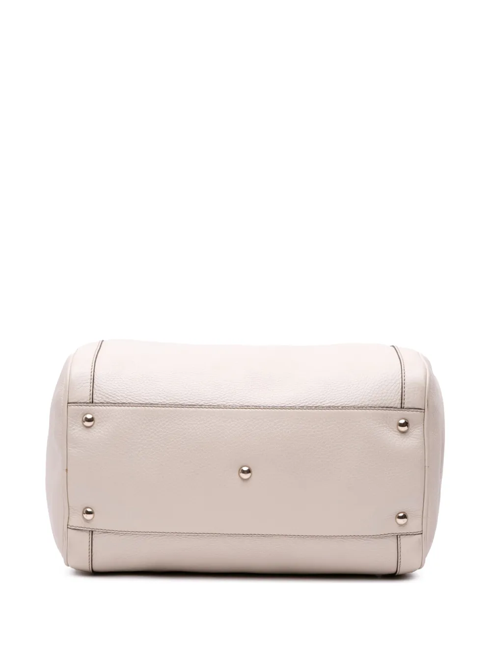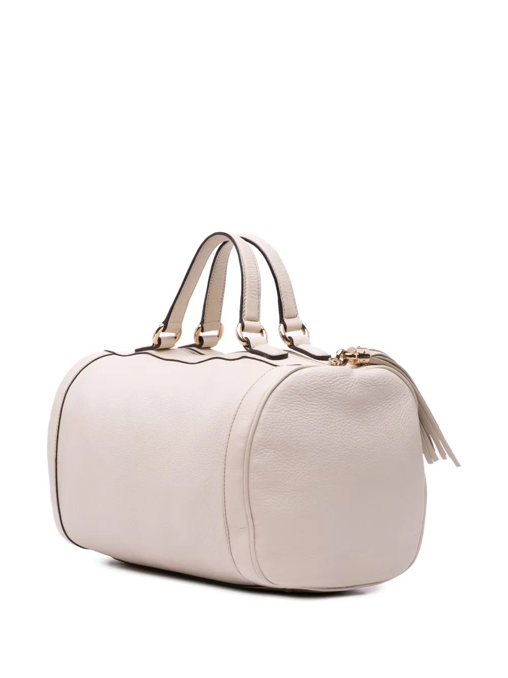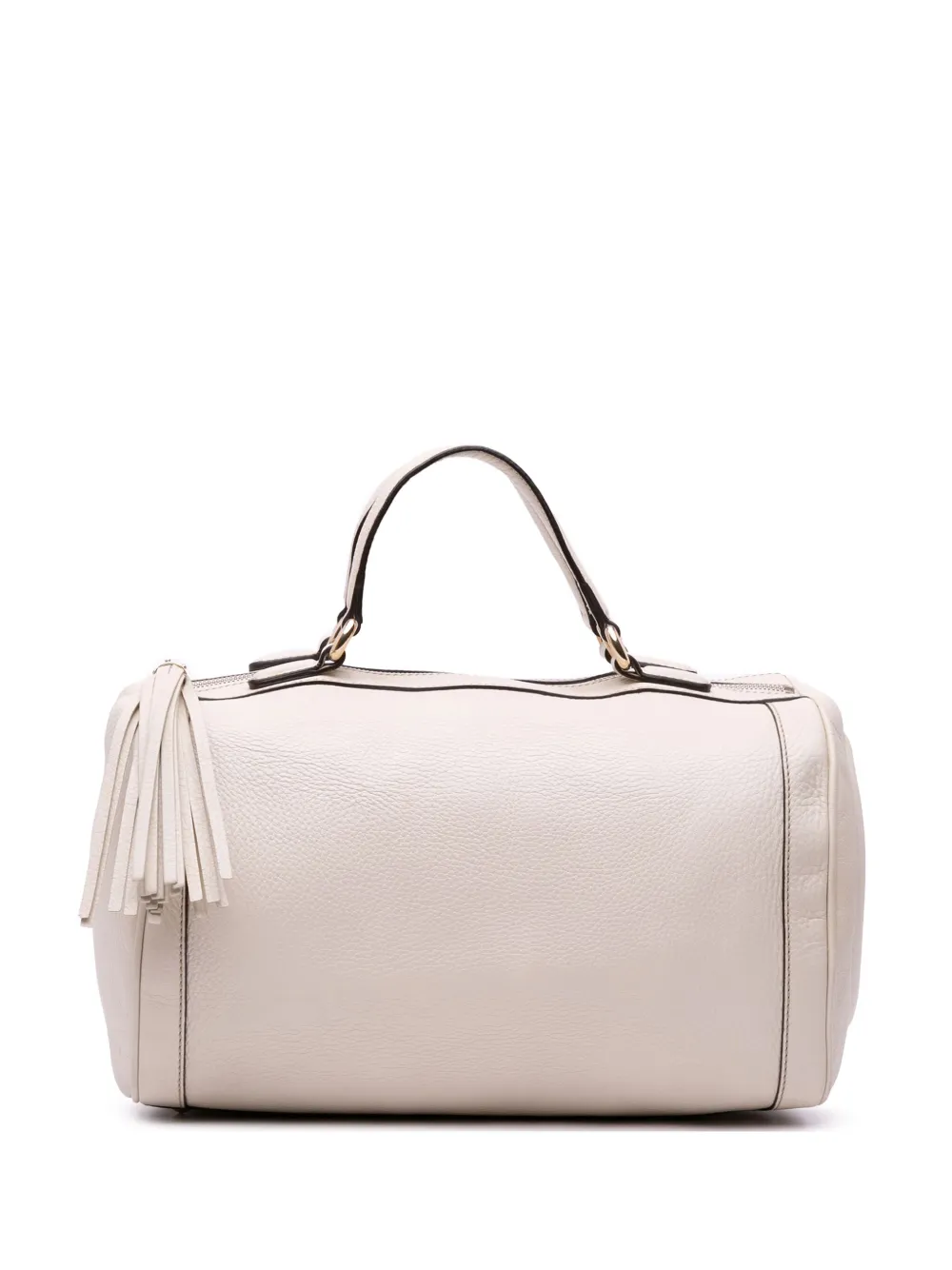 This boston bag features a leather body, flat leather handles, a top zip closure, and interior zip and slip pockets. White. Serial Number: 282302 493075. Inclusions: dust bag. Condition: GOOD. This previously owned and used item is in good condition with minimal signs of use. This may include fading of material or plating and scratches. Please refer to the photos on this product page for a detailed view of the item, including any damages declared.