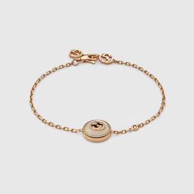 * 18k rose gold and mother-of-pearl stone * Chain with Interlocking G detail * Diamond Interlocking G charm 0.5' * 23 white diamonds, approximately 0.05 carats * Clasp closure with Interlocking G * Weight: 0.008lbs approximately * Made in Italy * Gucci guarantees, internally and within its supply chain, respect for standards of Social Environmental Responsibility in line with its sustainability strategy. Gucci gold, platinum and diamonds are certified by the Responsible Jewelry Council whose mission is to promote responsible, ethical, social and environmental practices that guarantee human rights throughout the gold and diamond supply chain, from mines to retail.