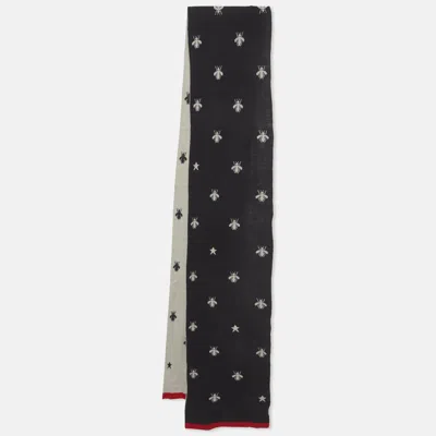 Gucci's wool muffler arrives in navy blue detailed with bee and star motifs that bring symbolic flair to winter accessories. The soft wool construction offers warmth while the patterned design provides visual contrast. Designed to pair effortlessly with outerwear this piece adds interest without sacrificing functionality.