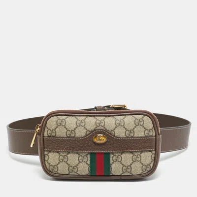 Presented in GG Supreme coated canvas with leather trim this Gucci Ophidia belt bag offers hands free functionality within a compact silhouette. The structured design allows for easy wear around the waist or across the body. Ideal for travel or everyday errands this piece combines practicality with a recognisable house motif.