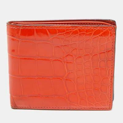 Vibrant and exquisitely crafted this Gucci bifold wallet is rendered in luxurious orange crocodile leather for a bold yet refined finish. Compact and sleek it opens to reveal a practical layout for your essentials making it the perfect blend of exotic elegance and everyday function.