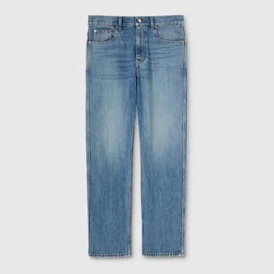 * Light blue washed certified cotton denim * Gucci Rosso Ancora naplak label * Five-pocket style * Belt loops * Button and zip fly closure * Slim fit * Total length: 41.3'; Hem width: 7.5'; based on a size 32 * Label: Cow leather * Fabric: 100% Cotton * Pocket lining: 65% Polyester, 35% Cotton