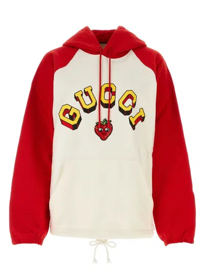 A relaxed attitude speaks volume as casual pieces become indispensable. Sweatshirts, hoodies, and t-shirts with drop shoulders, cropped lengths, and generous fits are adorned with signature embellishments. Crafted in a soft cotton jersey, this raglan hooded sweatshirt is adorned with a Gucci print and strawberry patch. Off white and red light felted cotton jersey, Gucci print with strawberry patch, Fixed hood with drawstring, Raglan sleeves, Kangaroo pocket, Elastic cuffs, Drawstring hem, Length: 28.1" based on a size small, Made in Italy, The product shown in this image is a size small