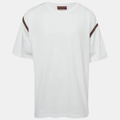 Gucci keeps this jersey T shirt relaxed letting the white base carry Web trim along the sleeves. The soft roomy cut works well with denim tailored trousers or layered under a jacket making it a dependable option for everyday wear.