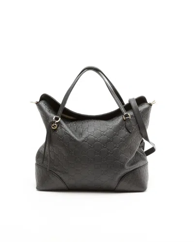 Gucci Guccissima Bree Tote Bag• Black Guccissima leather• Gold-tone hardware• Dual top handles• Detachable shoulder strap• Beige canvas lining with one internal pocketOverall Preloved Condition: Very Good Condition.Exterior Condition: Very Good. Light trace of use.Interior Condition: Very Good. Light trace of use.Hardware: Shiny with light scratches.Delivered with brand booklets, detachable shoulder strapMade in ItalyDimensions:Height 26 cmWidth 28 cmDepth 13 cmHandle drop 10 cmStrap drop 50 cmPlease note that the majority of our items are vintage and therefore have tales to tell unless stated otherwise. Therefore, please look at pictures, descriptions and measurements provided as they give you the best idea of the story this item has to tell.