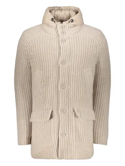 米色 钮扣开合 兜帽 侧置缝线口袋 罗纹针织