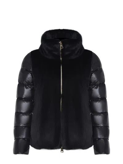 Herno down jacket made of ultralight nylon in black. High collar. Synthetic fur on the front. Long sleeves. Double-slider zip closure. Side welt pockets. Goose down filling. 100% polyamide.