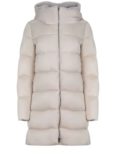 Herno down jacket made of matte nylon in light beige color. Fixed hood. High collar. Double-slider zipper closure. Pockets with invisible zippers. Goose down filling. 100% polyester.