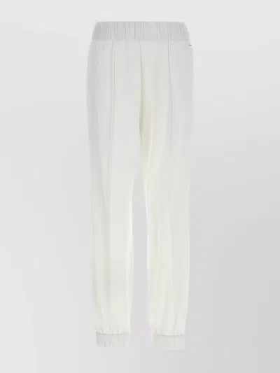 白色 平纹针织纹理 对比面料拼接 侧边条纹细节 金色logo标牌 logo雕刻银色五金配件 锥形裤腿 松紧抽绳裤腰 侧置两个插袋 踝部弹性设计