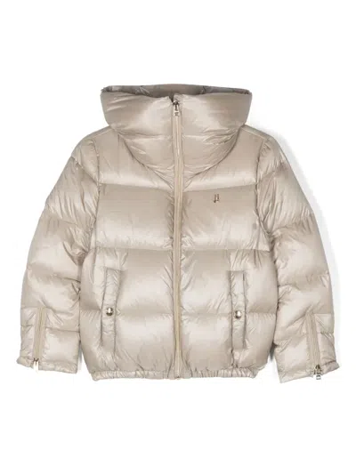 feather down puff jacket from HERNO KIDS featuring feather down, padded design, embroidered logo at the chest, stand-up collar, front zip fastening, long sleeves, cuff zips, fitted-cuff sleeves, elasticated hem, front stud-fastening pocket and beige.