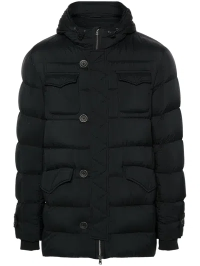 black goose down padded design drawstring hood long sleeves with ribbed cuffs two chest flap pockets two front flap pockets straight hem multiple internal slip pockets full lining front button and zip fastening L'Eskimo nylon down jacket Size -