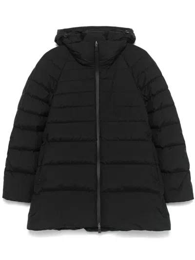 黑色 羽绒填充 防水 GORE-TEX® 材料 衬垫设计 防风 绗缝 正面饰有双向拉链 高领 抽绳兜帽 长袖 弹性松紧边 两侧饰有拉链口袋 背面饰有logo印花 全衬里 内置口袋 平直下摆