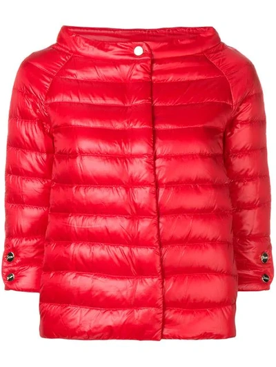 Mixing revolutionary production techniques and Italian craftsmanship tradition, Herno designs unique pieces for the harshest winters. This red goose down and cotton blend short puffer jacket features a boat neck, a snap button closure, a concealed front fastening, three-quarter length sleeves and button cuffs.