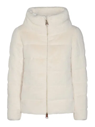 Chaqueta blanca de herno con mangas largas, cuello alto, bolsillos con cremallera y vestibilidad normal.