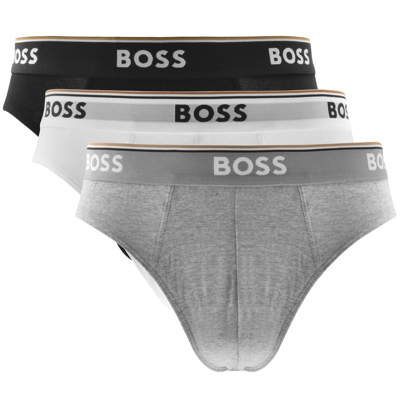 BOSS Underwear Triple Pack Of Briefs In White Grey and Black Three pairs of dynamic stretch cotton briefs with elasticated waistbands in white grey or black featuring the signature BOSS logo woven in black or white and also a woven striped design in black white and brown. 95% Cotton And 5% Elastane.