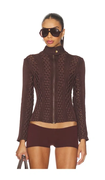 ISA BOULDER Threadline Jacket in Chocolate. Size S. Also in XS, M, L, XL. ISA BOULDER Threadline Jacket in Chocolate. Size XS, M, L, XL. 90% rayon 10% elastane. Hand wash. Front zip closure. Midweight open knit fabric. Item not sold as set. IBOU-WO3. PF25WJK04.