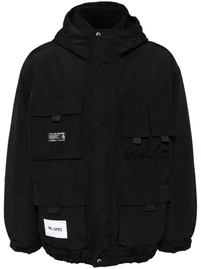 black front zip fastening drawstring hood multiple cargo pockets to the front logo patches to the front two side inset pockets long sleeves elasticated cuffs elasticated hem fleece lining