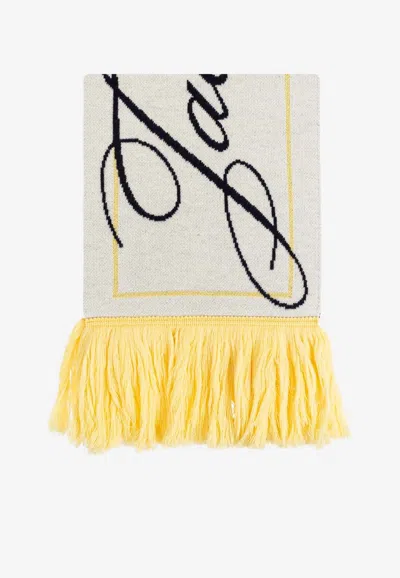JACQUEMUS Logo Print Fringe Wool Scarf In White