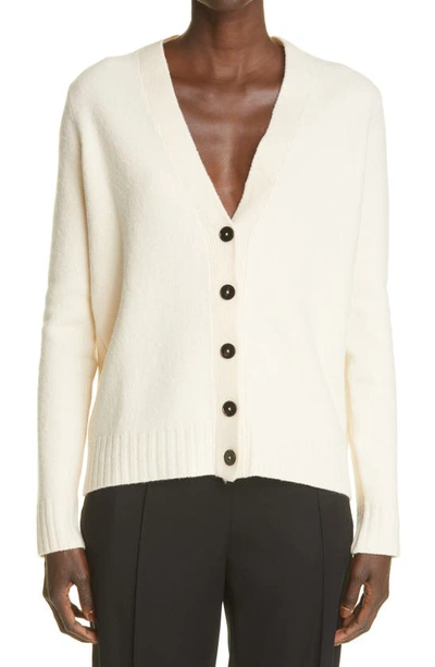 Light beige wool rib-trimmed wool cardigan from JIL SANDER featuring ribbed-knit edge, V-neck, front button fastening, long sleeves and straight hem.